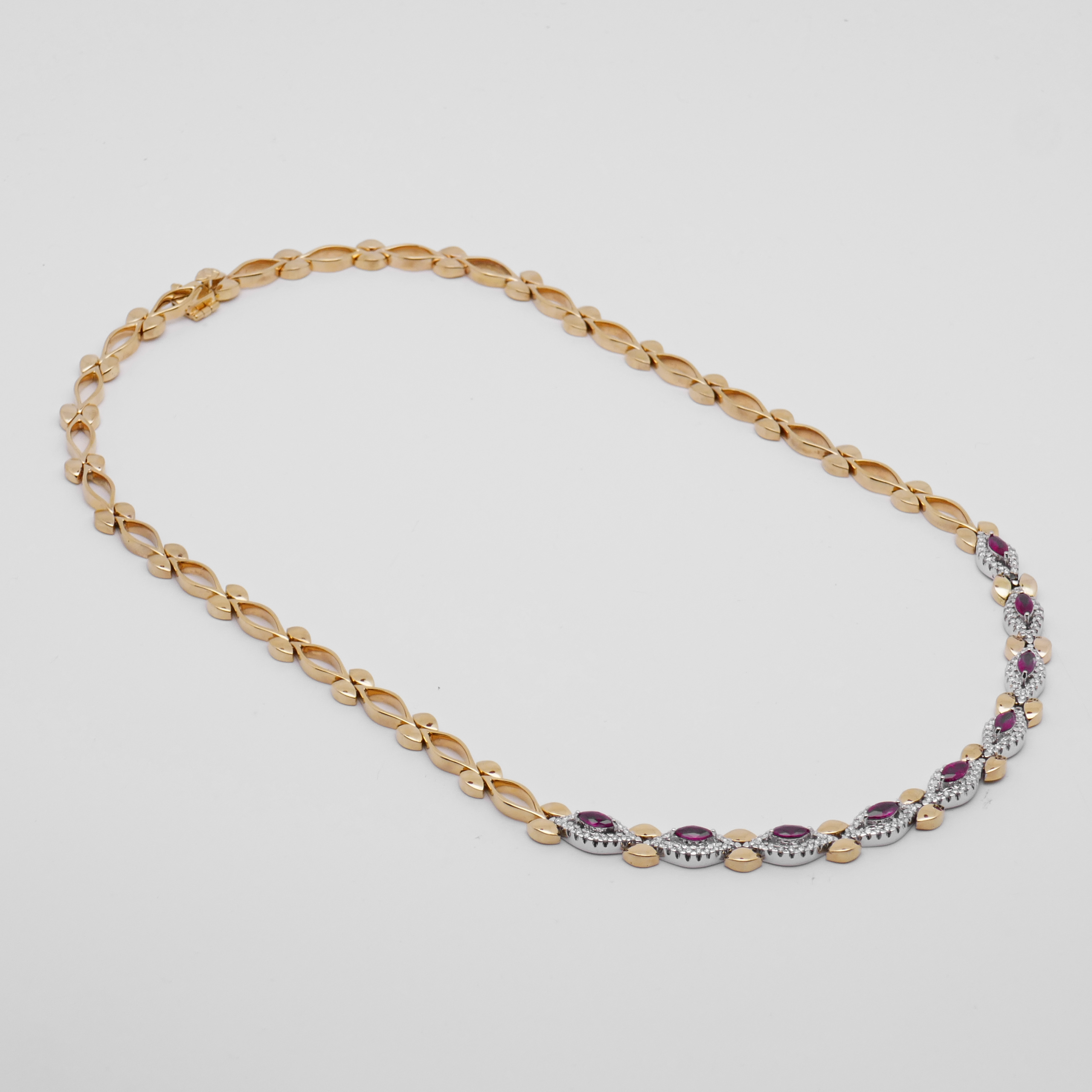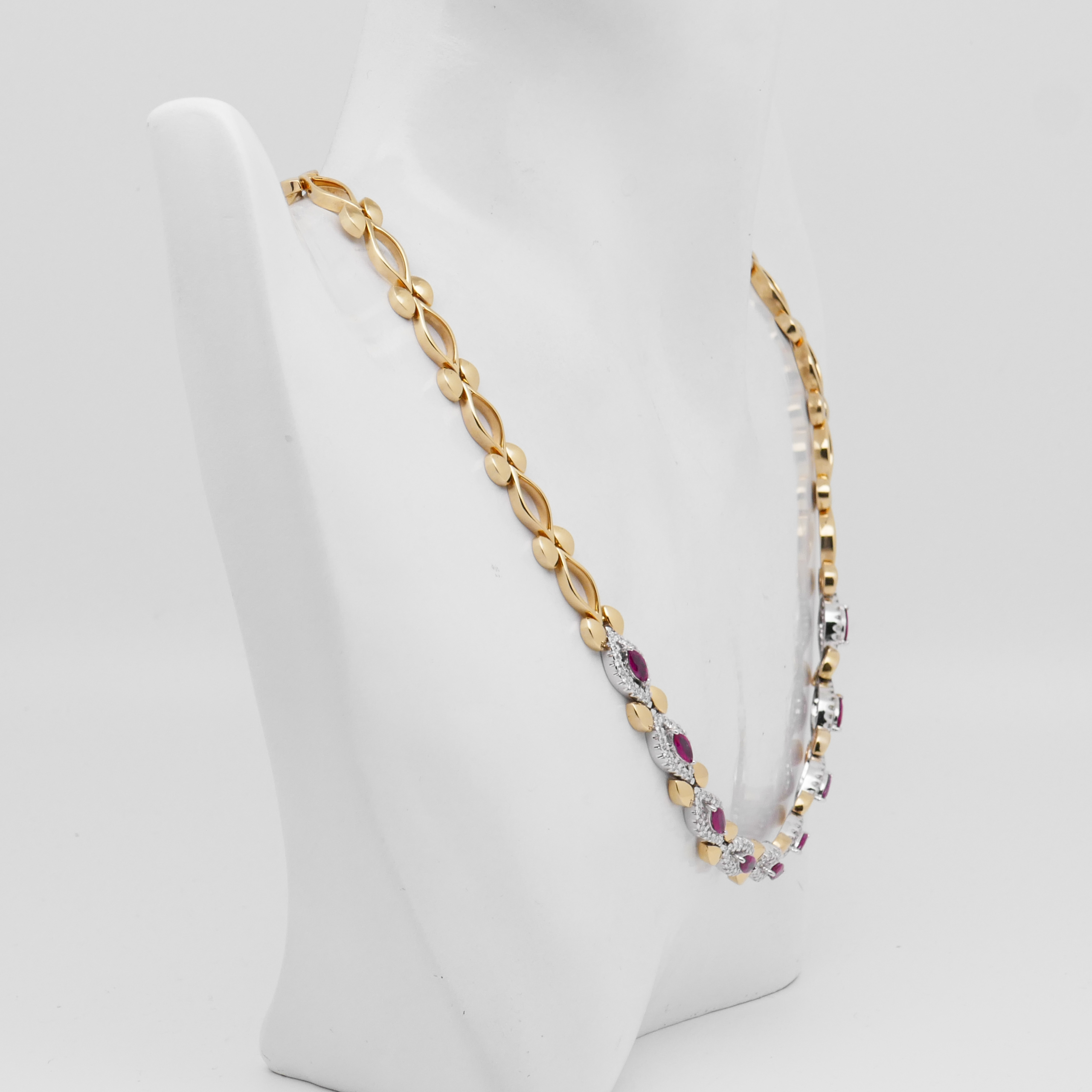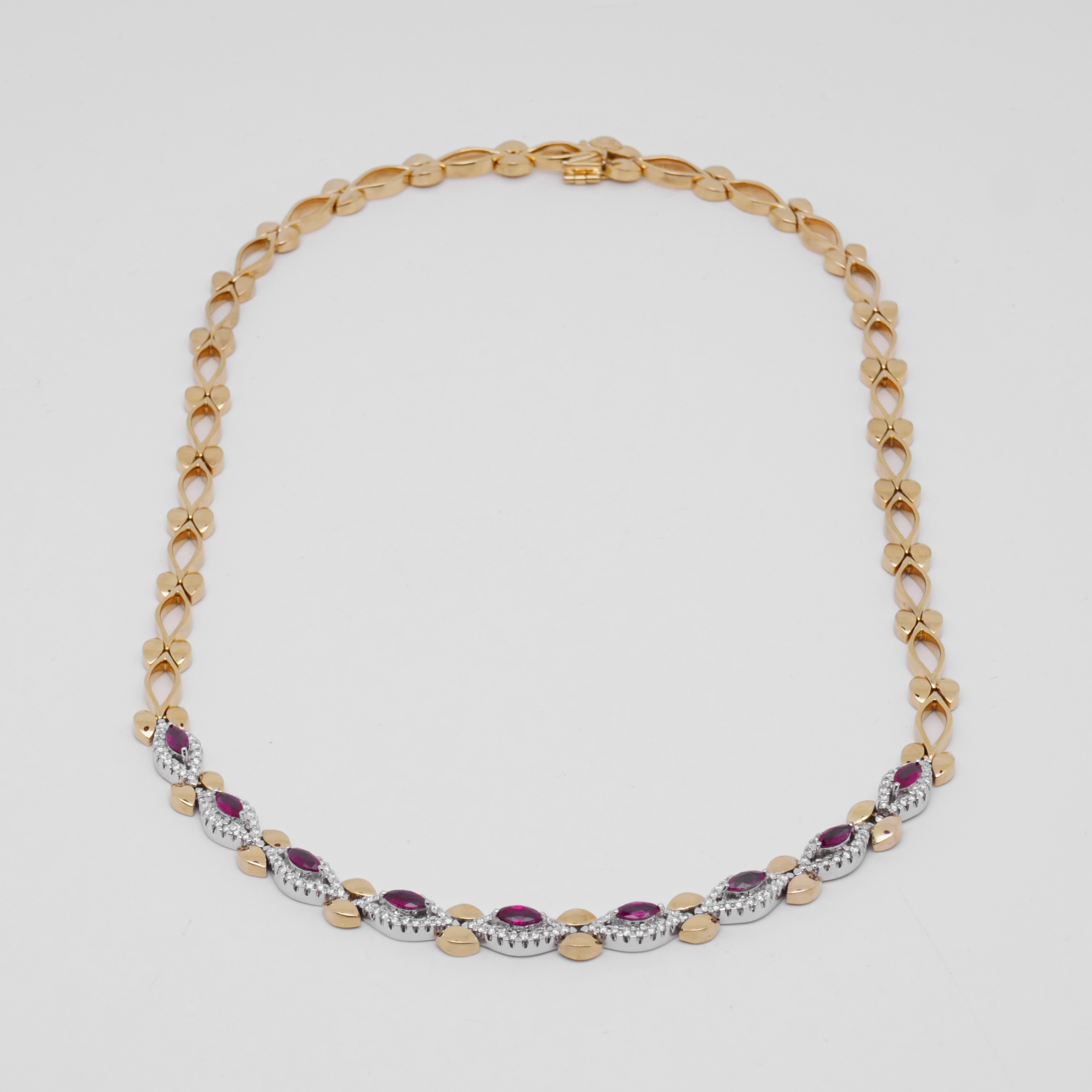 Der vordere Collierbereich ist meisterhaft mit acht leuchtend rubinroten Edelsteinen im Marquiseschliff besetzt, die von zarten, pavégefassten Brillanten in strahlendem Weiß umgeben werden. Diese Anordnung verleiht dem Collier eine unvergleichliche Tiefe und ein edles Farbspiel zwischen warmem Gold, funkelndem Weiß und intensivem Rubinrot.