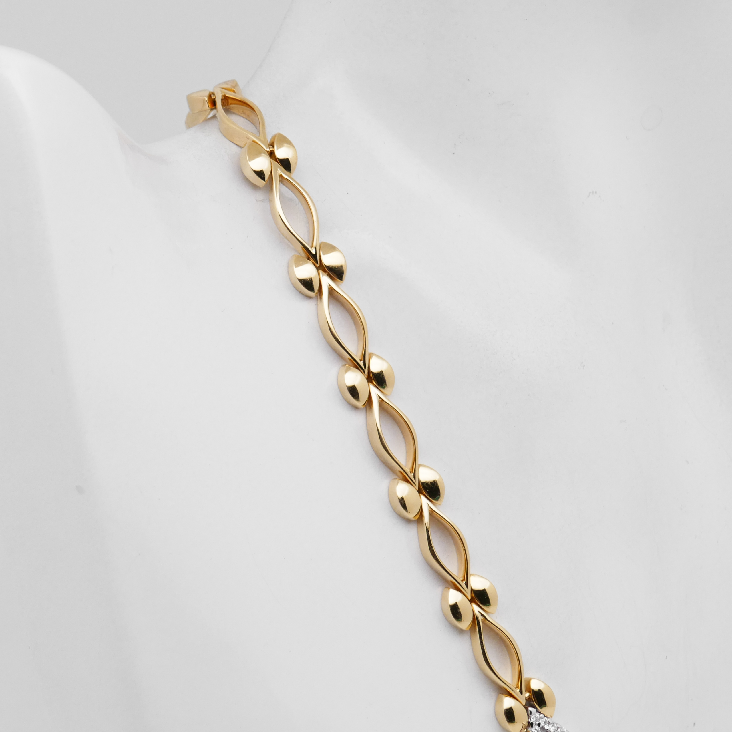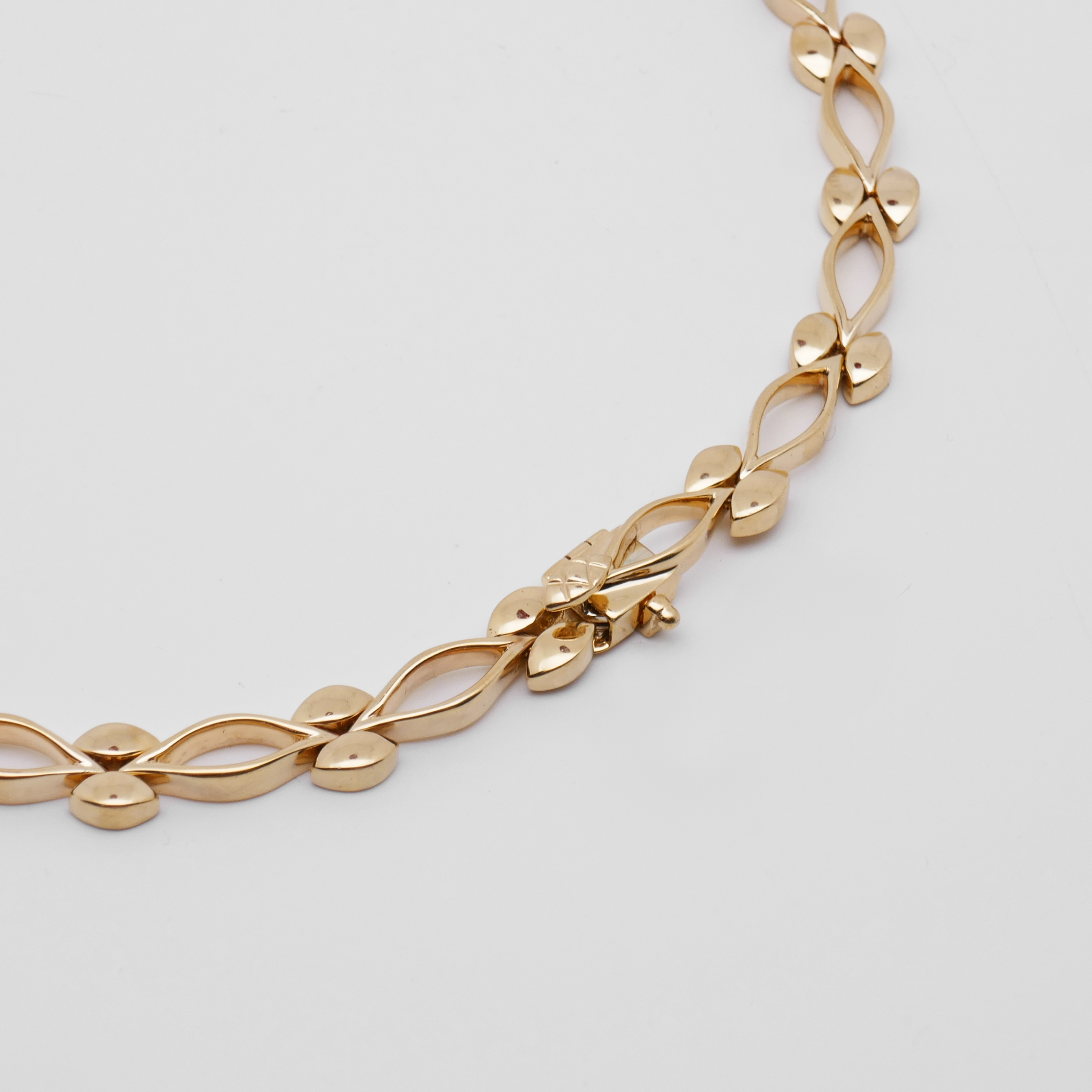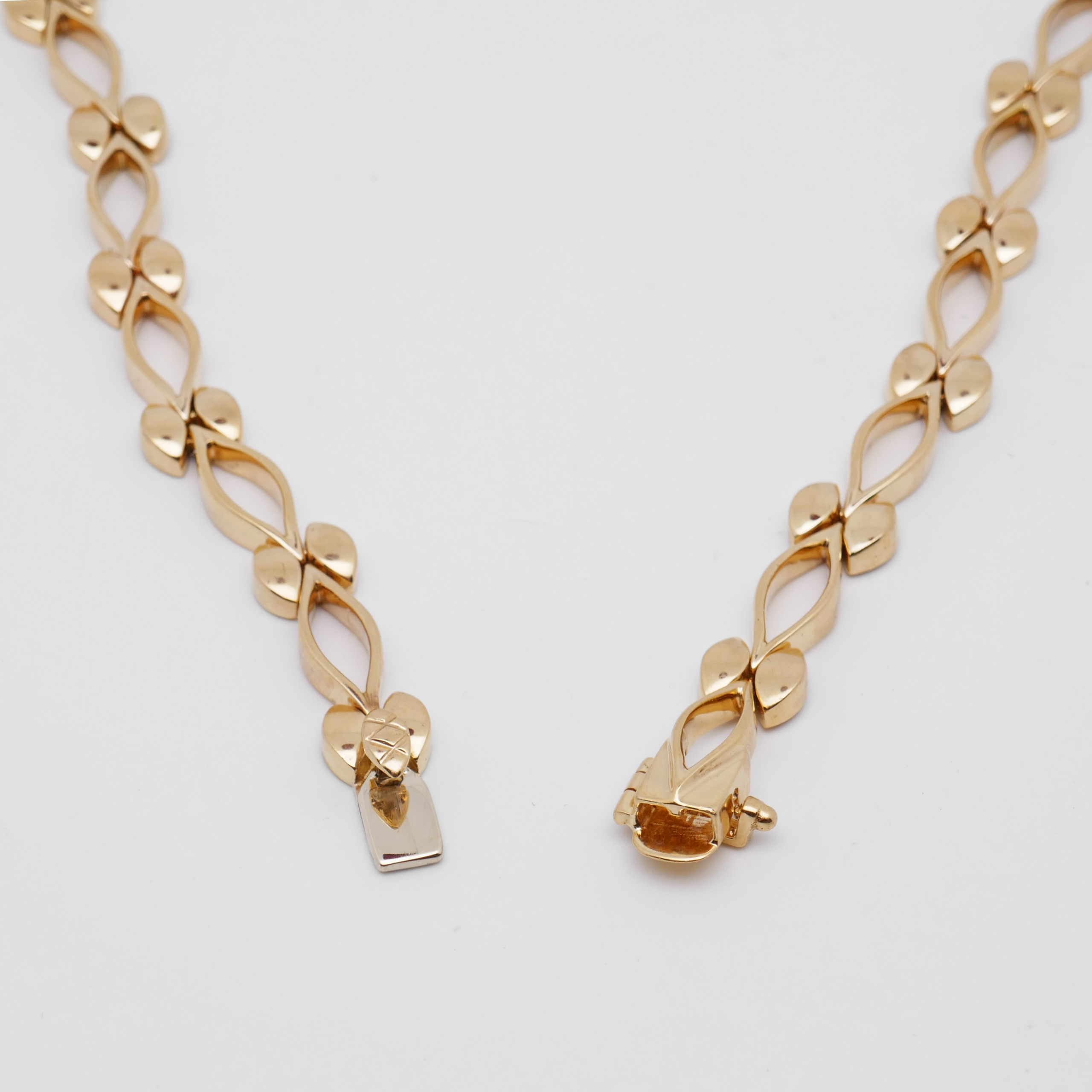 Die Glieder der Halskette sind elegant geschwungen und verbinden sich zu einem sanften, fließenden Verlauf, der sich perfekt an die Halslinie anschmiegt. Das wechselnde Muster aus glänzenden Rund- und Bogenformen sorgt für eine lebendige, dynamische Optik, während das Weißgold-Mittelstück den luxuriösen Charakter dezent hervorhebt.