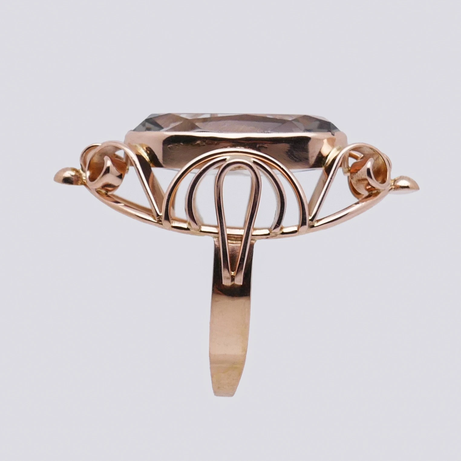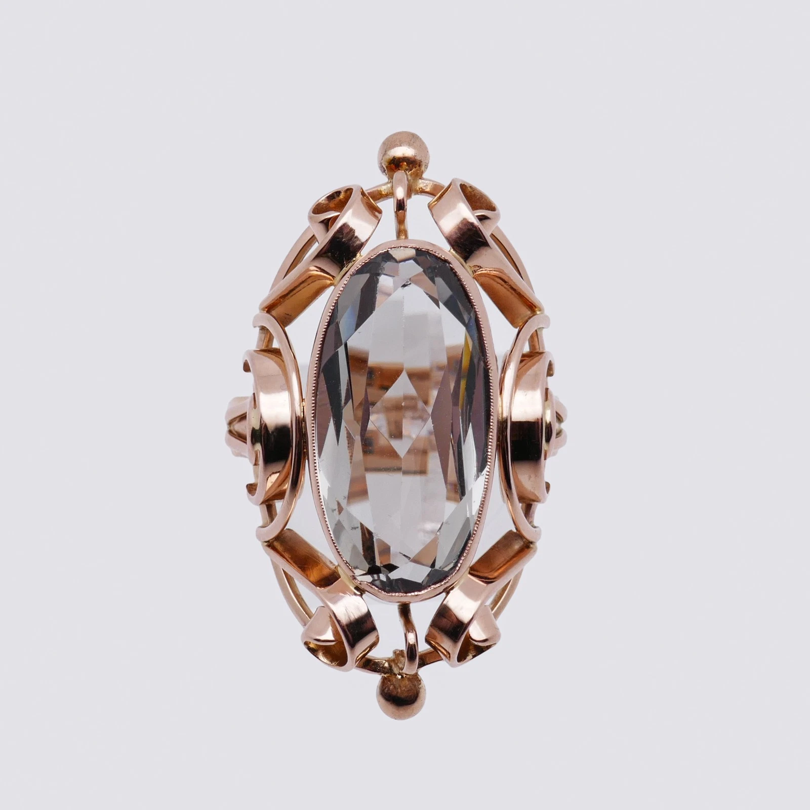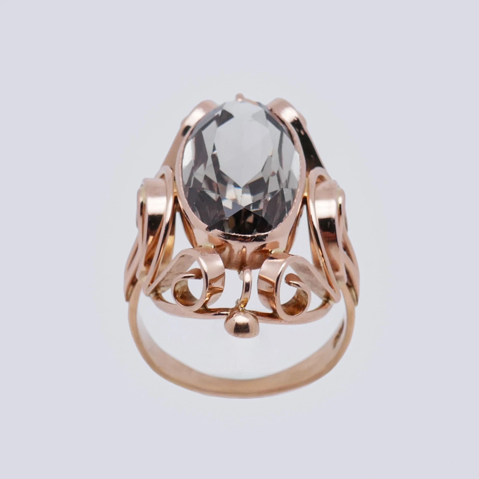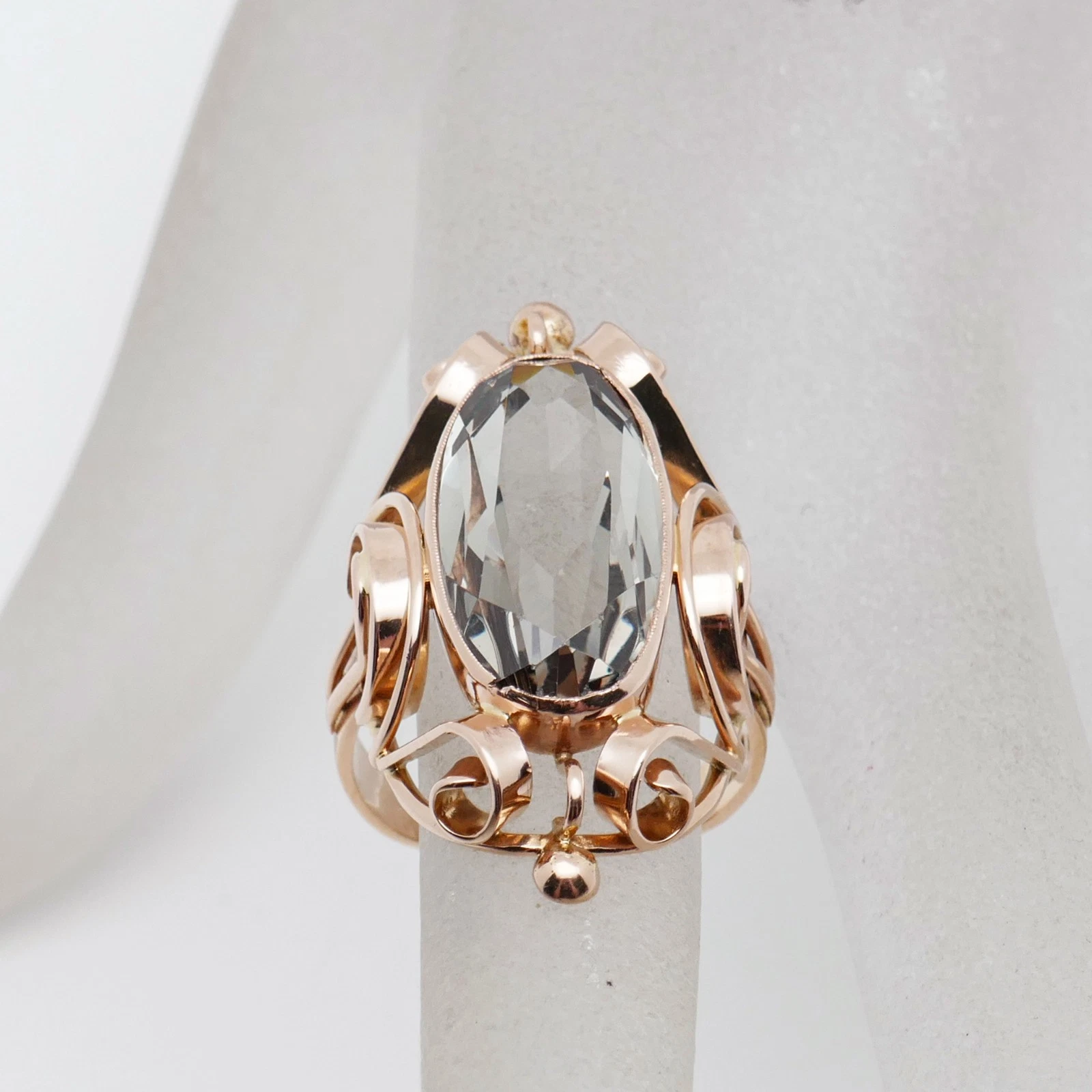 Entdecken Sie diesen prachtvollen Vintage-Ring aus edlem 585er (14k) Rotgold – ein filigran gearbeitetes Meisterwerk mit kunstvollen Verzierungen und einem beeindruckenden, facettierten Edelstein im Ovalschliff. Dieses Schmuckstück vereint zeitlose Eleganz mit handwerklicher Raffinesse.