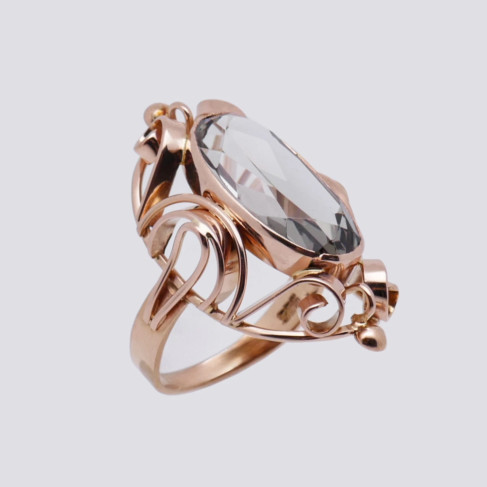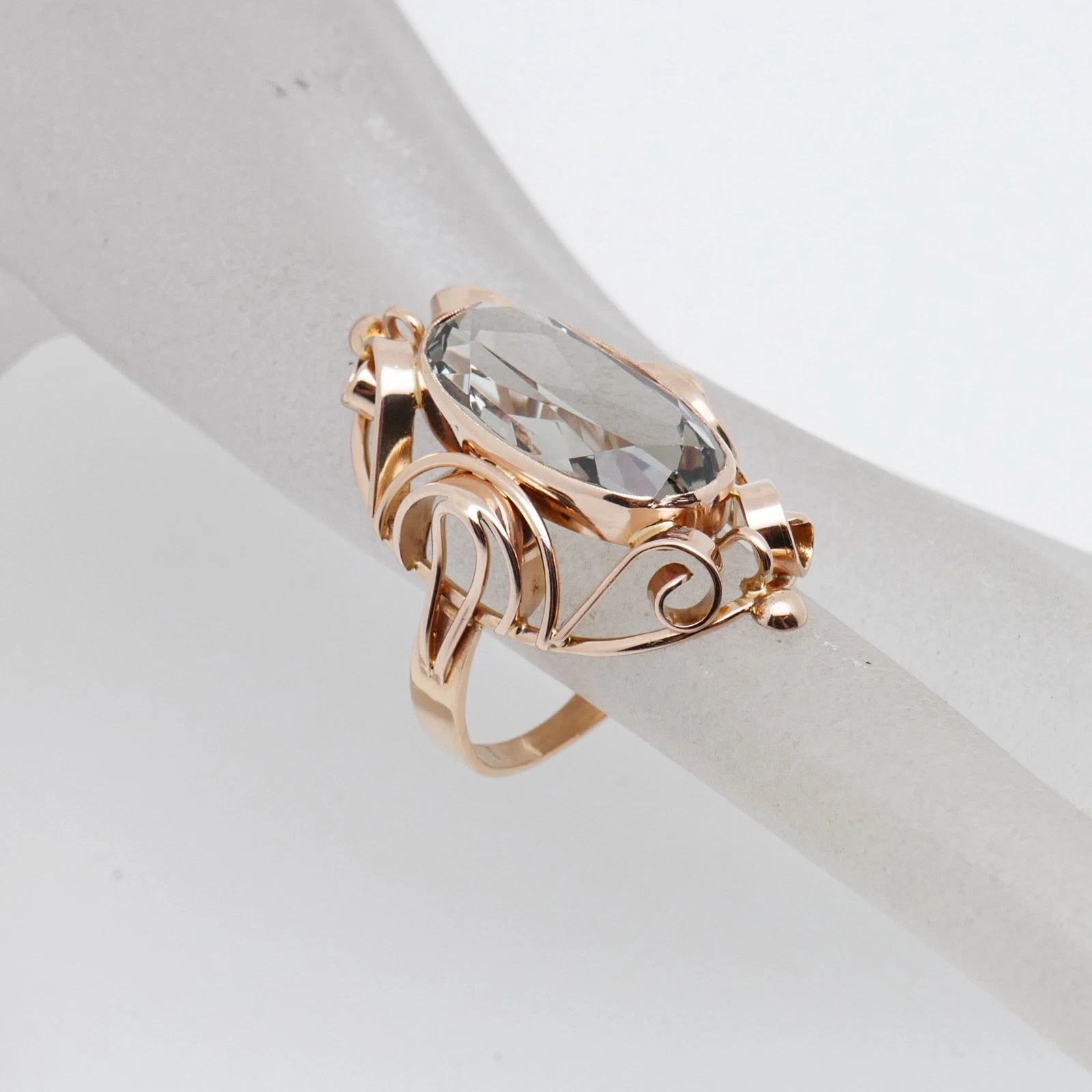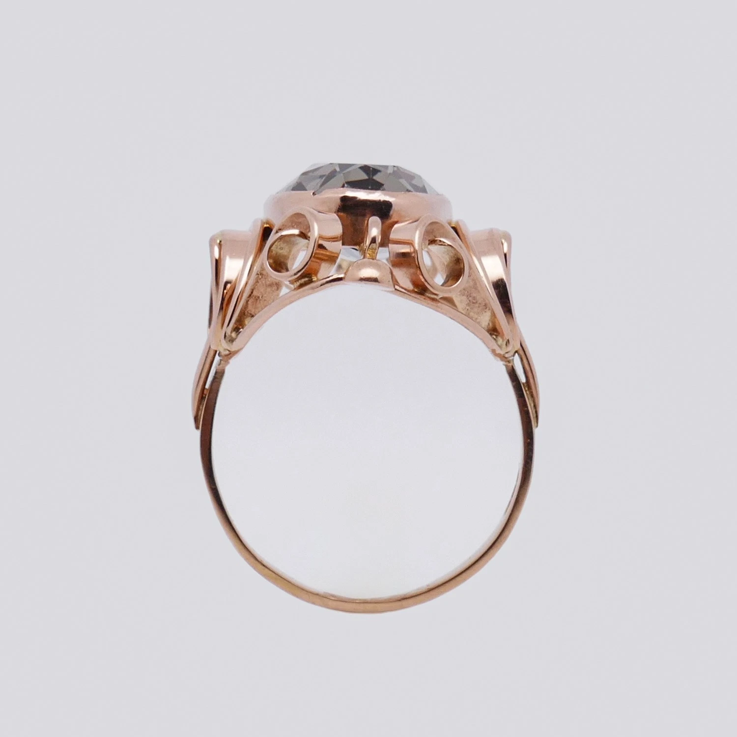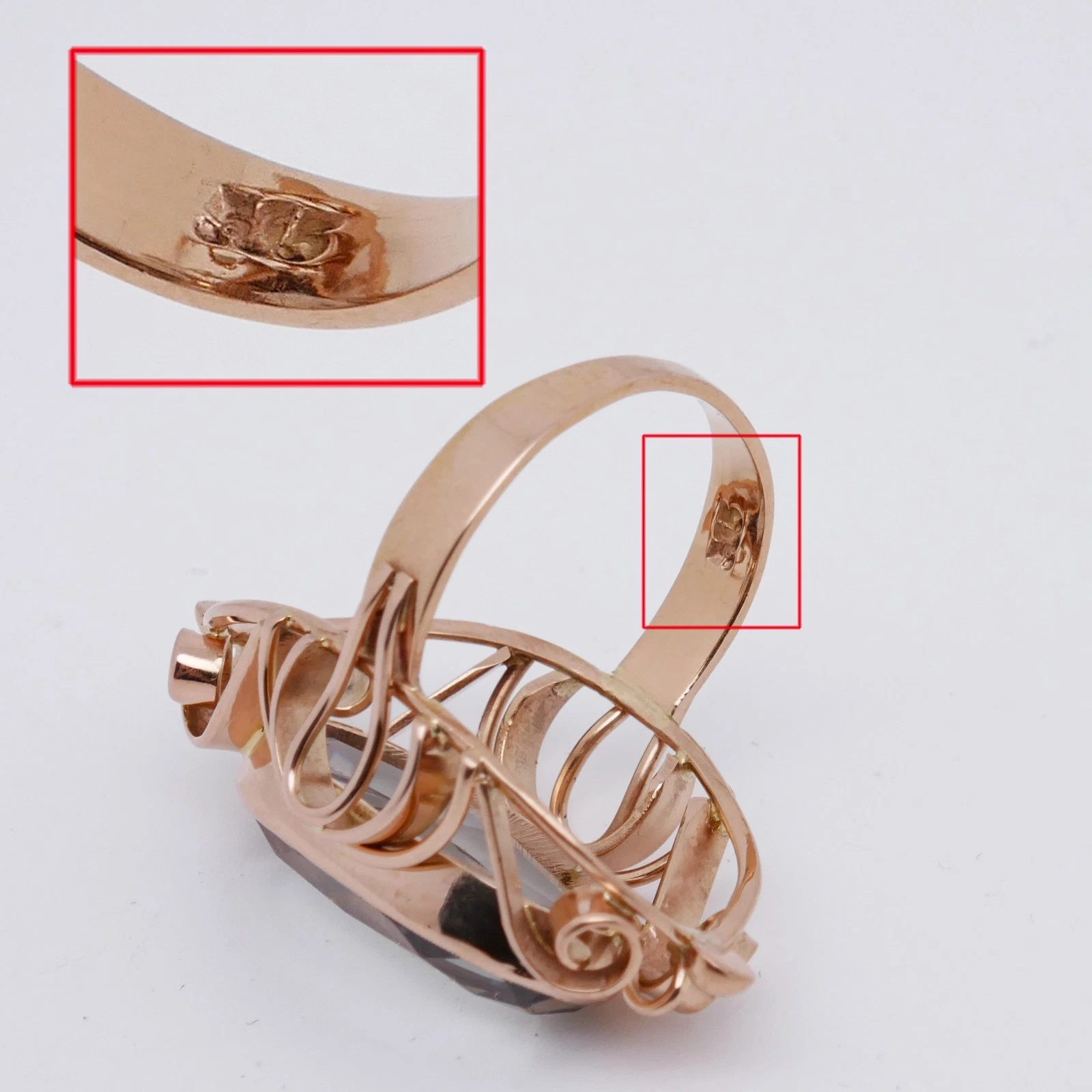 Entdecken Sie diesen prachtvollen Vintage-Ring aus edlem 585er (14k) Rotgold – ein filigran gearbeitetes Meisterwerk mit kunstvollen Verzierungen und einem beeindruckenden, facettierten Edelstein im Ovalschliff. Dieses Schmuckstück vereint zeitlose Eleganz mit handwerklicher Raffinesse.
