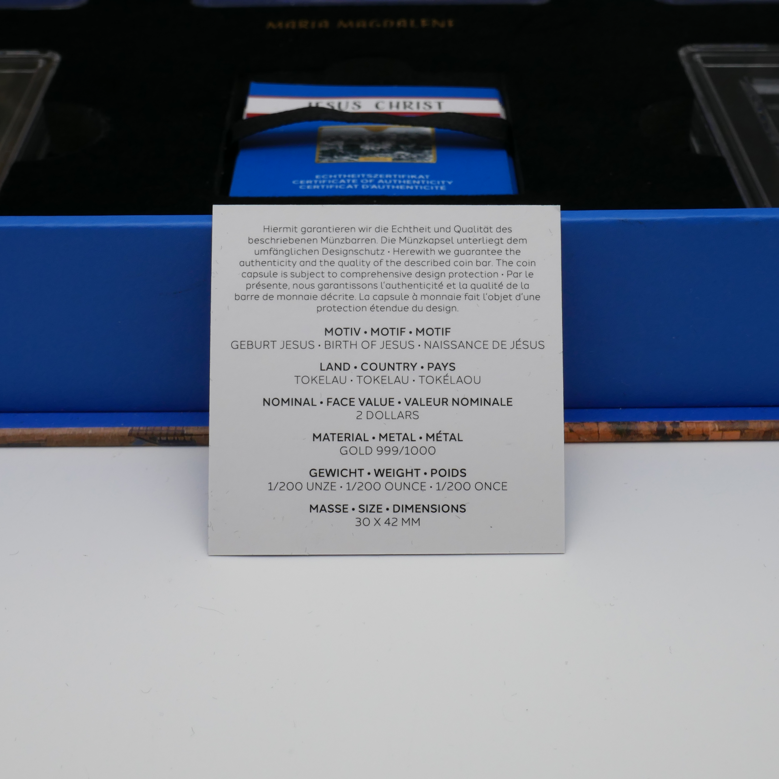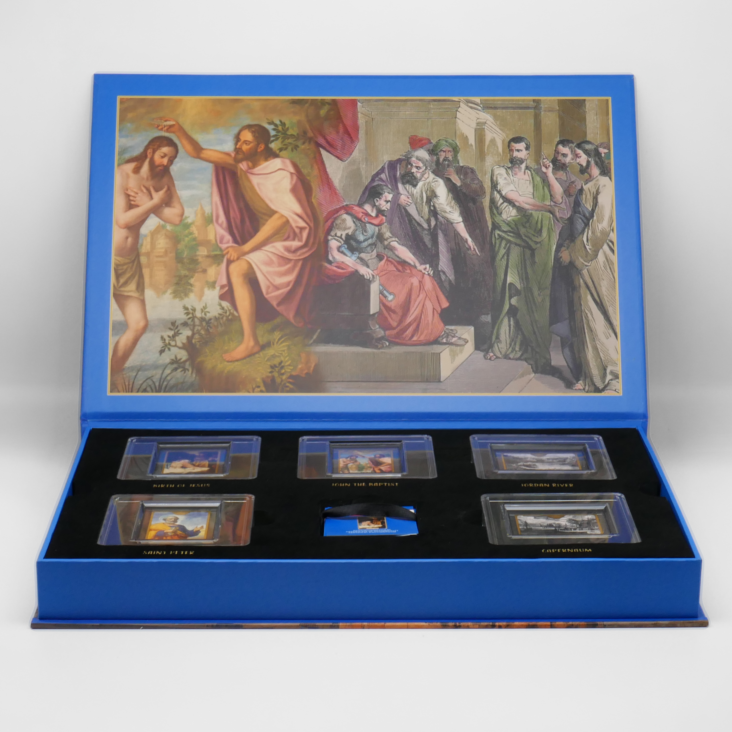Das Set ist thematisch dem Leben Jesu Christi gewidmet und zeigt bedeutende Personen sowie Orte aus der biblischen Überlieferung. Jeder Goldbarren trägt ein farbiges Motiv und befindet sich einzeln geschützt in einer transparenten Kapsel. Die Barren sind in einer aufwendig gestalteten Präsentationsbox mit religiöser Darstellung im Deckel eingelegt.