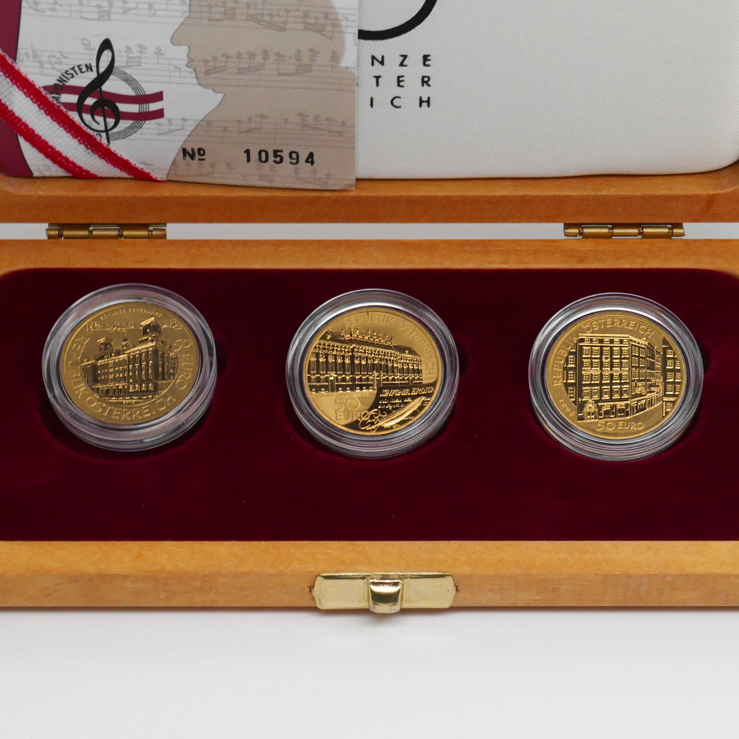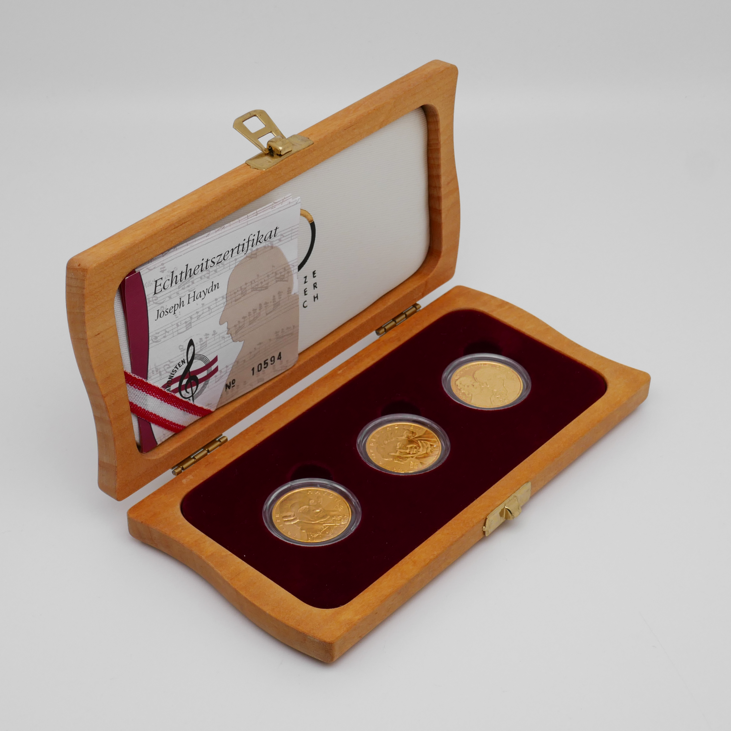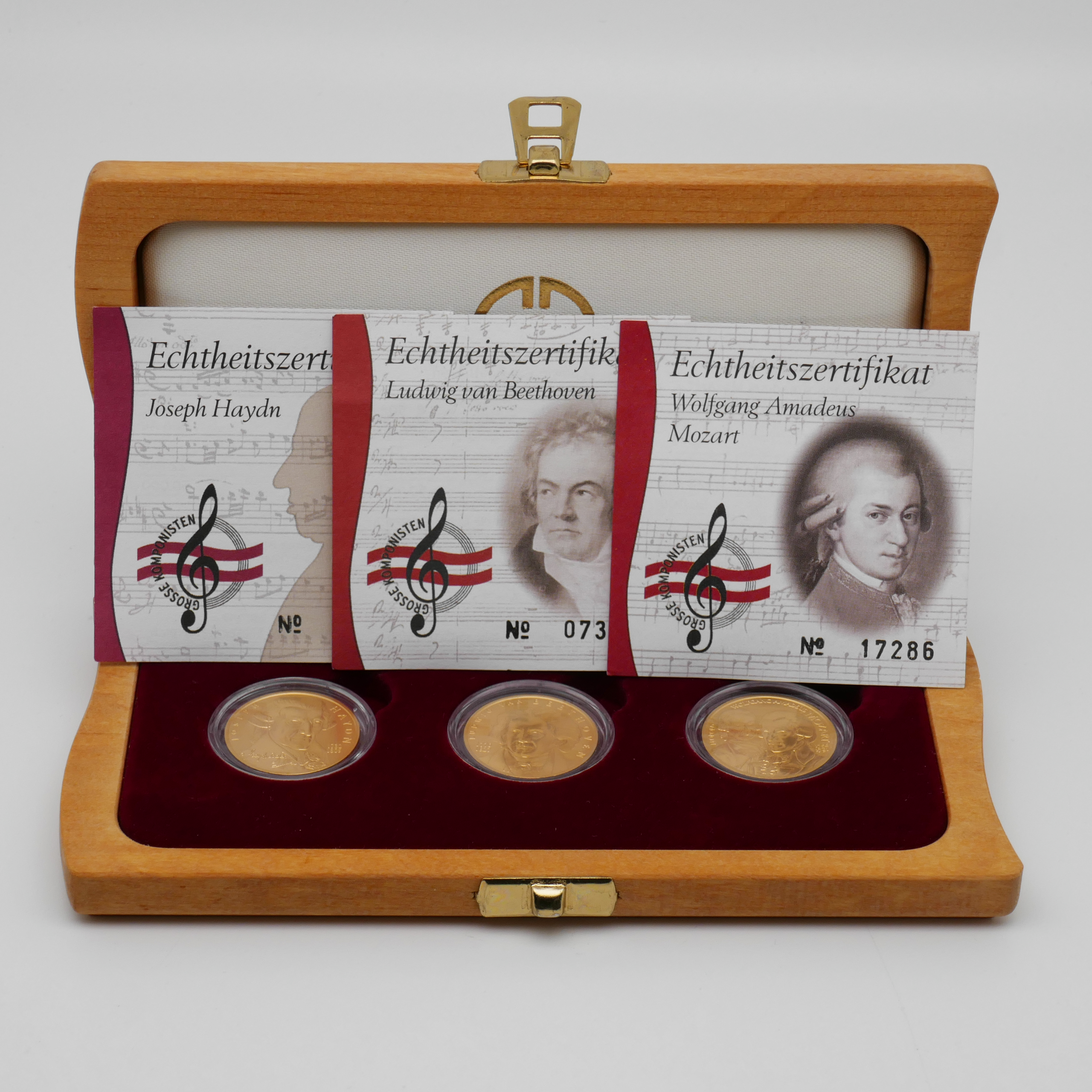 Hochwertiges Goldmünzen-Set „Große Komponisten“ der Münze Österreich, bestehend aus drei gekapselten Münzen mit den Motiven Joseph Haydn, Ludwig van Beethoven und Wolfgang Amadeus Mozart.