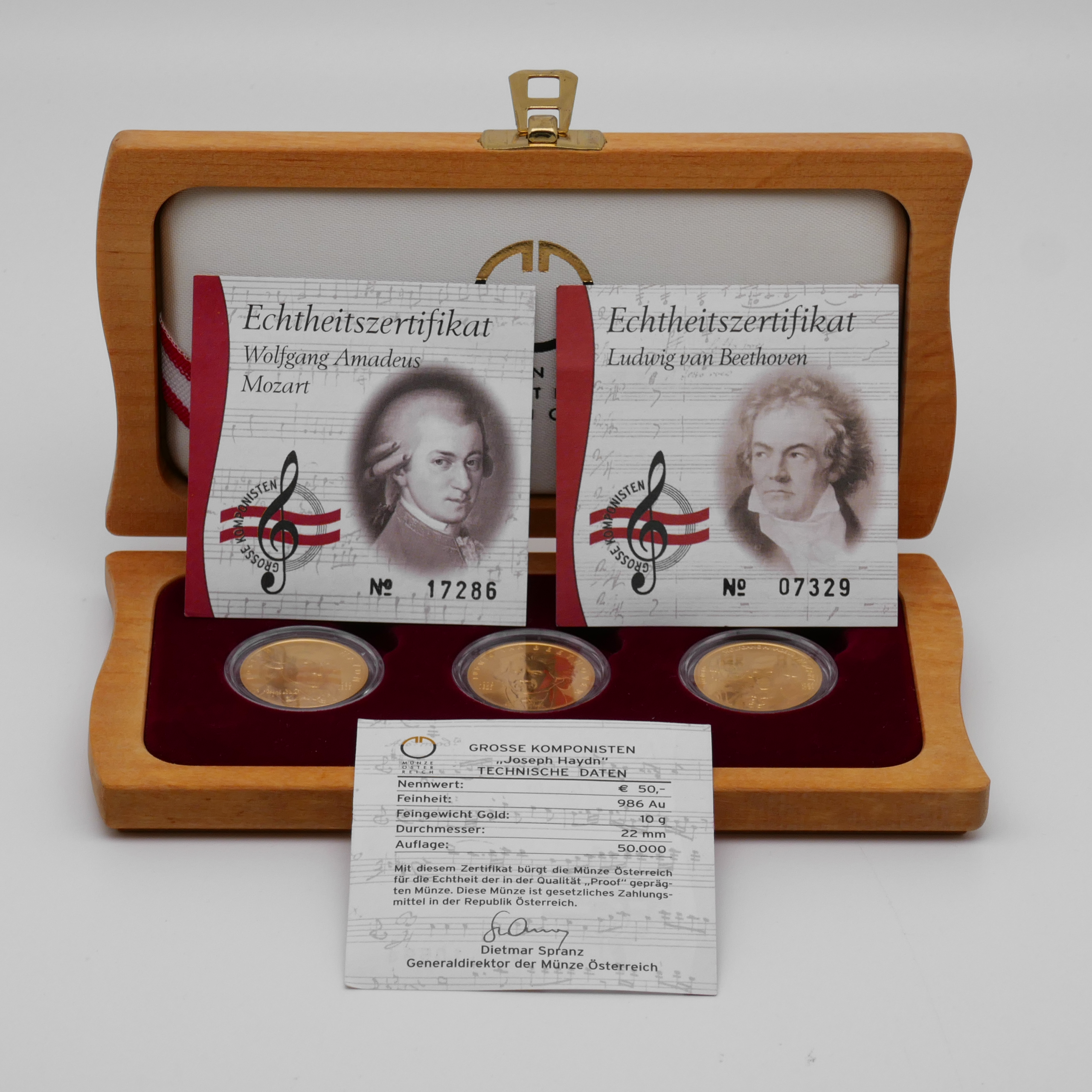 Hinweis: Die technischen Daten zu Feinheit, Feingewicht, Durchmesser, Prägequalität und Auflage sind dem sichtbaren Zertifikat zur Ausgabe „Joseph Haydn“ entnommen.