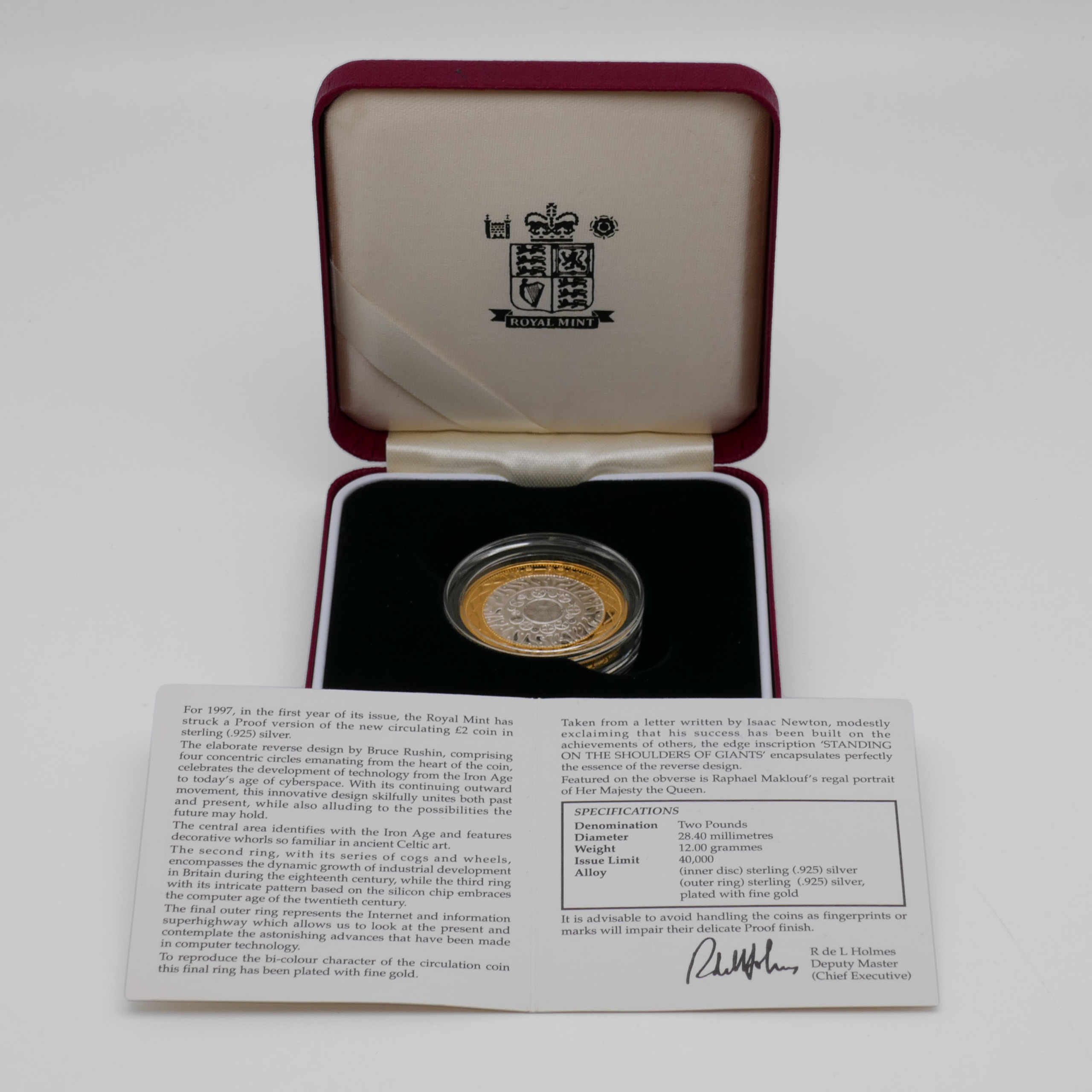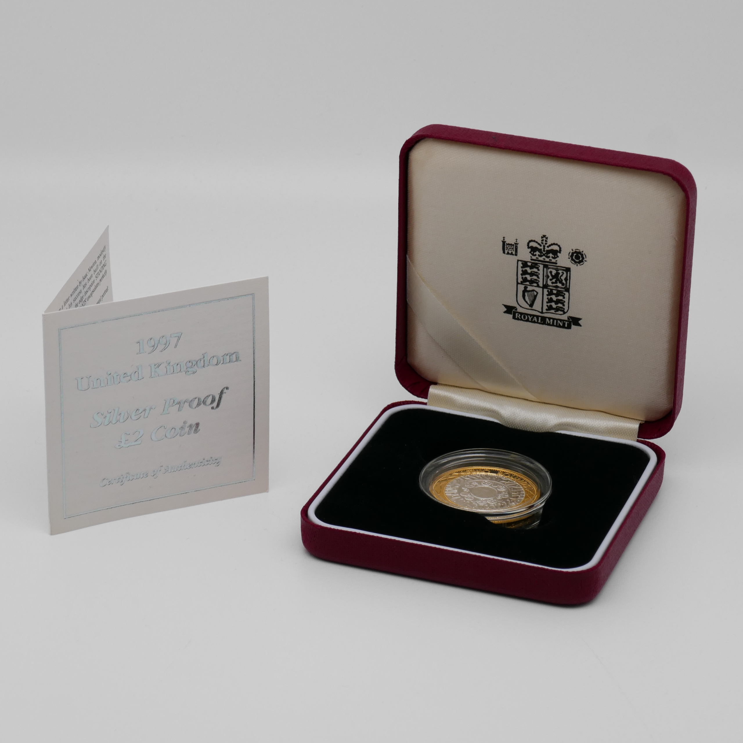 Hochwertige 1997 United Kingdom Silver Proof £2 Coin der Royal Mint, präsentiert im originalen Etui mit Zertifikat.